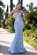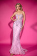 This striking dress from Portia & Scarlett showcases a corset bodice adorned with sparkling crystals and a delicate lace overlay. This gown is completed with a sweeping train for added sophistication. Make a statement and capture attention at your next event with this exquisite design.