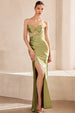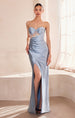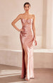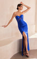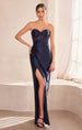 This strapless fitted gown embodies elegance with its sweetheart neckline and expertly structured bodice, designed to highlight your silhouette. The gathered waistline gracefully accentuates your curves, while the leg slit adds a hint of allure. Crafted from soft semi-stretch satin with a lace-up corset back, this gown is a stunning choice for formal or black-tie events.